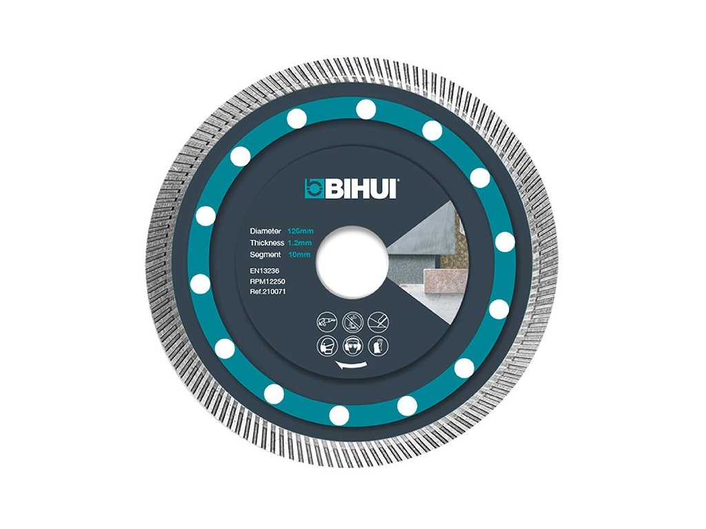 BIHUI Turbo diamantový kotouč je určen pro přesné řezání obkladů, dlažeb a přírodního i umělého kamene. Díky super tenké tloušťce 1,2 mm umožňuje čisté a jemné řezy s minimálním odporem, menším zahříváním a nižší prašností.
