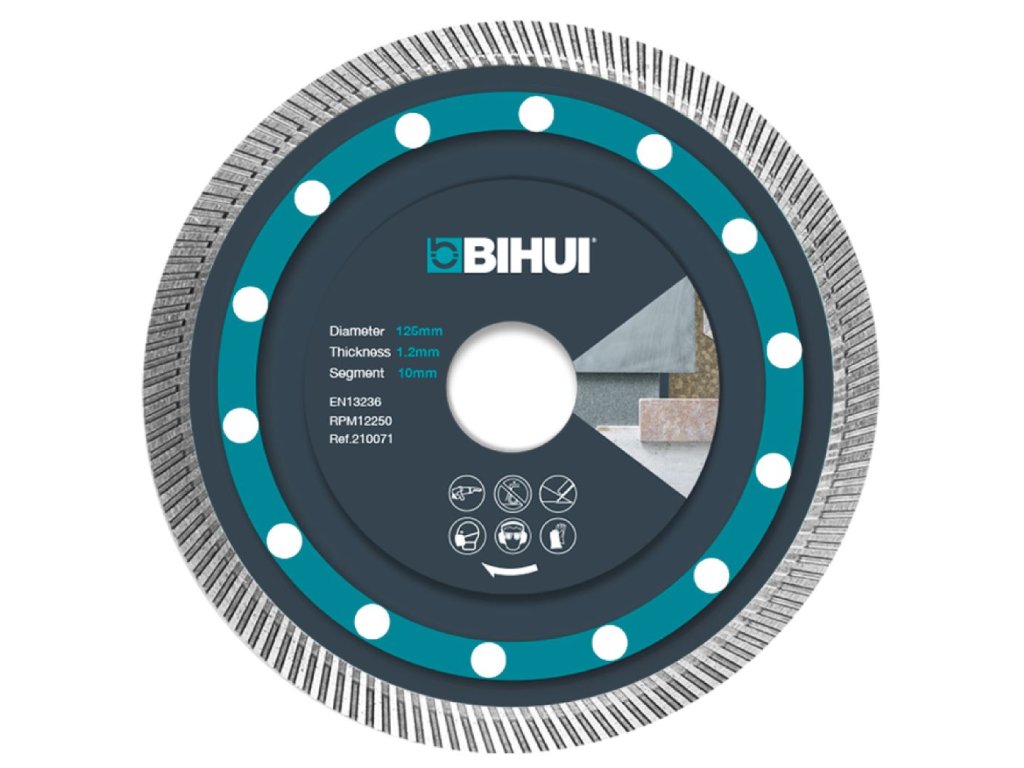 BIHUI Turbo diamantový kotouč je určen pro přesné řezání obkladů, dlažeb a přírodního i umělého kamene. Díky super tenké tloušťce 1,2 mm umožňuje čisté a jemné řezy s minimálním odporem, menším zahříváním a nižší prašností.