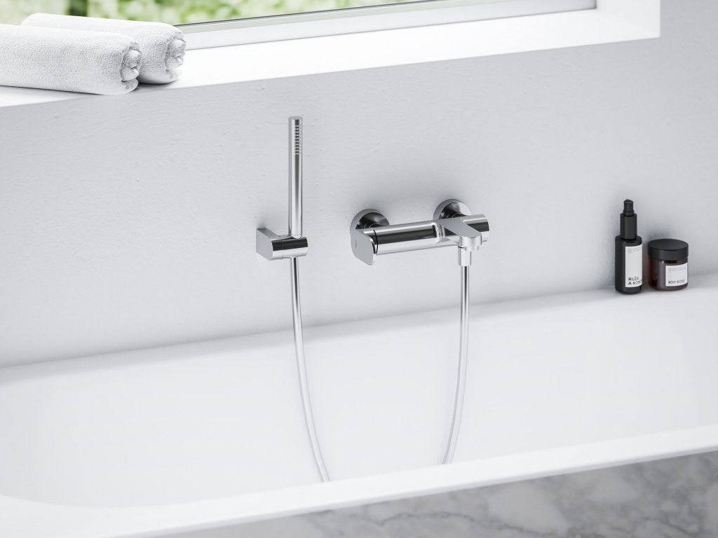 Nástěnná vanová baterie Eleganta se sprchovým setem. V chromovém provedení. Zapuštěný perlátor.- rozteč baterie: 150 mm