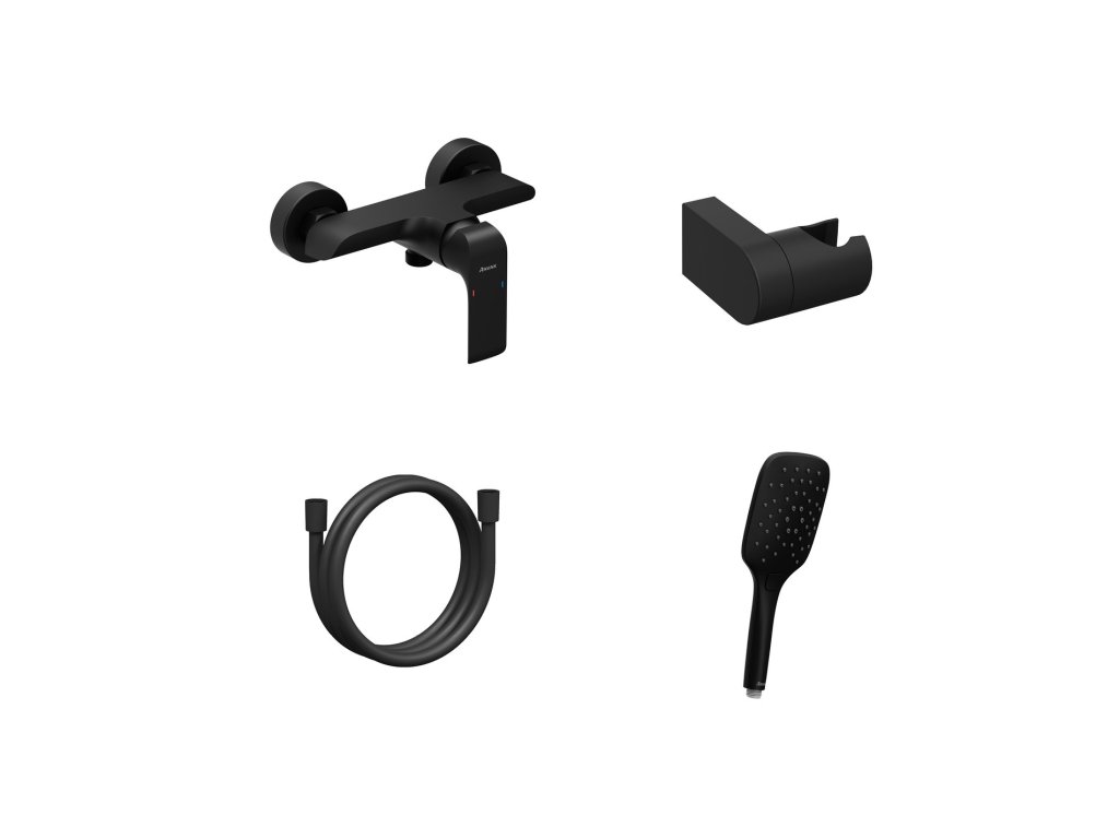 Nástěnná sprchová baterie Flat se sprchovým setem. V černém matném provedení.- rozteč baterie: 150 mm