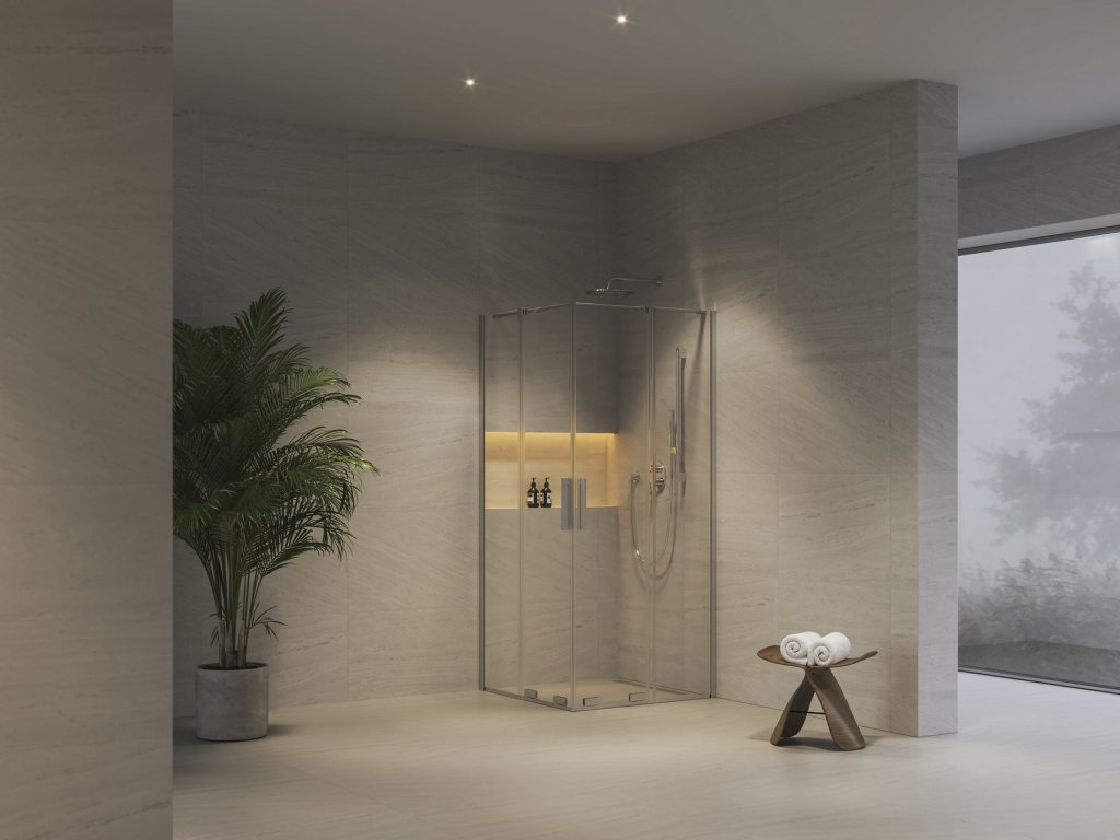 Čtyřdílný rohový sprchový kout Roll v provedení lesklý chrom a s výplní z čirého skla s ochrannou vrstvou Ravak AntiCalc®. Posuvný systém otevírání.- rozměr: 90x90 cm