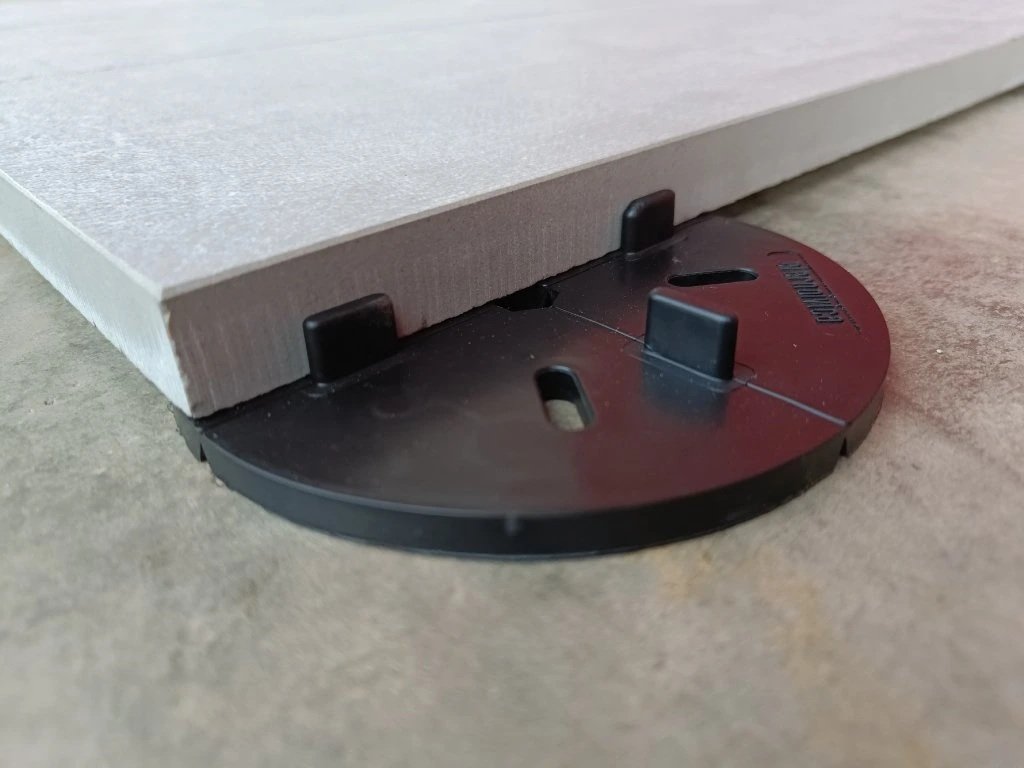 Gumový terč pod dlažbu o výšce 6 mm. Spára pro dlažbu 4 mm. Jedná se nejnižší terč s vymezením spáry pro dlažbu. Vhodný pro pokládku na jakýkoliv povrch na Vaší terase. Materiál SBS guma, recyklovatelná.