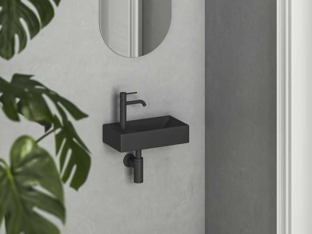 Keramické umývátko Veda Wall k instalaci na zeď, bez přepadu. V černém matném provedení. Levá varianta.- rozměry (šxh): 40,8 x 22,2 cm