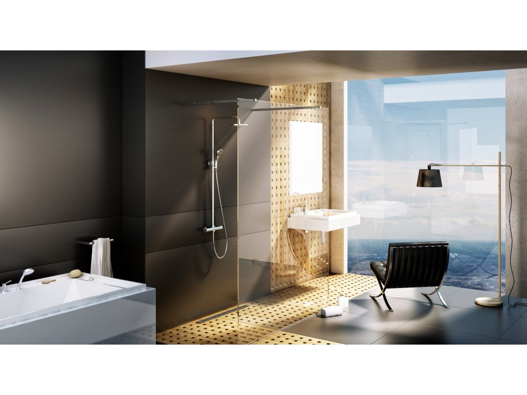 Walk-In se ukotvuje přímo na podlahu. Zkombinujte kout s odtokovým žlabem. Díky tomu vynikne dlažba vaší koupelny.